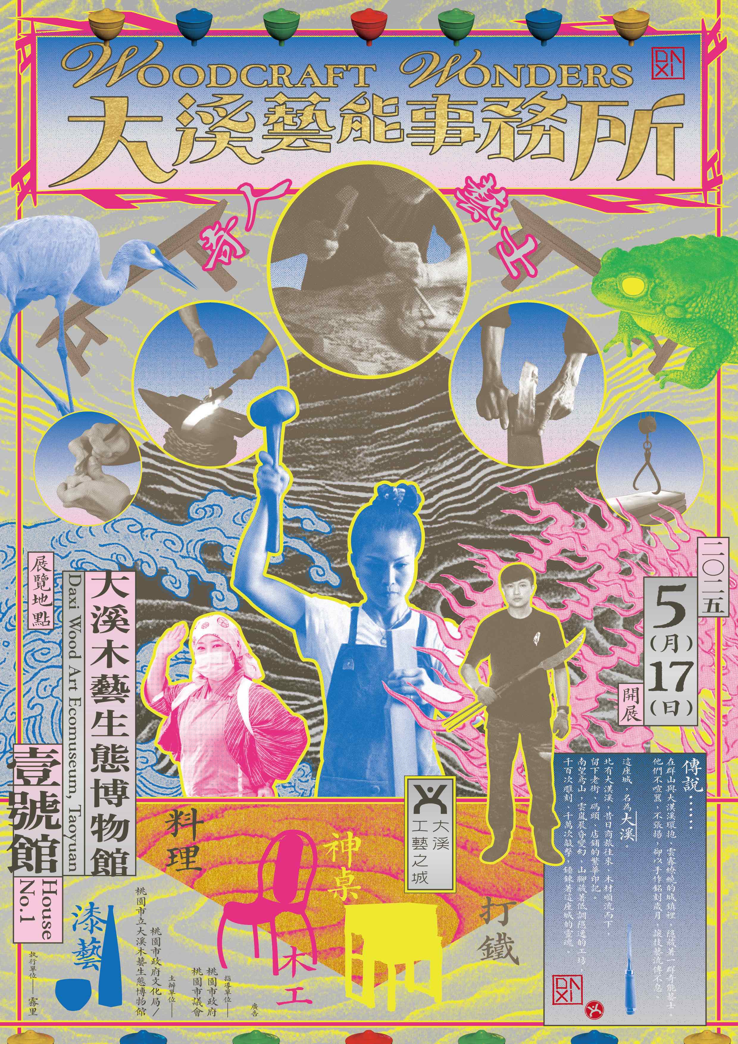《大溪藝能事務所》以一群隱身山城裡的工藝藝能者為題,烈焰火中的打鐵師、神龕神桌旁的俠女、天衣無縫的鑿花師...而現在有更多人承襲了不可思議的能力!觀者可透過展覽一窺這座城市的神秘面貌、直觀地認識這些工藝後繼者,一次揭開大溪的奇幻面紗!